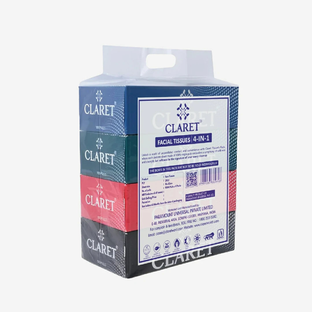 The Claret Facial Tissue 4 in 1 Combo includes four boxes of 100 pulls each, made with 100% virgin pulp and no optical brightening agents. These soft, 2-ply tissues are perfect for everyday facial and hygiene needs. Each sheet measures 18 cm x 20 cm, ensuring the ideal balance between surface area, softness, and strength. A smart pick for families, professionals, and skincare lovers alike.