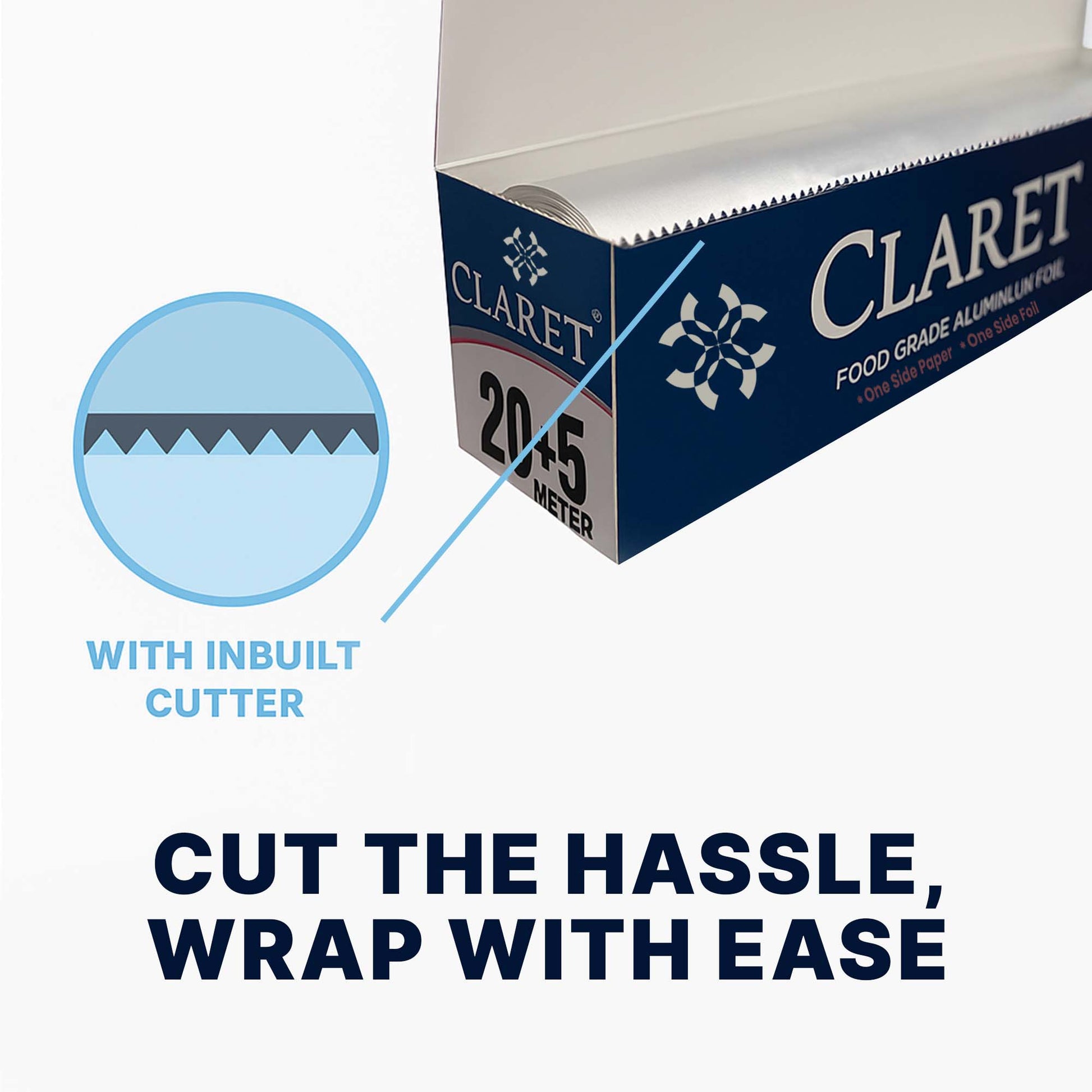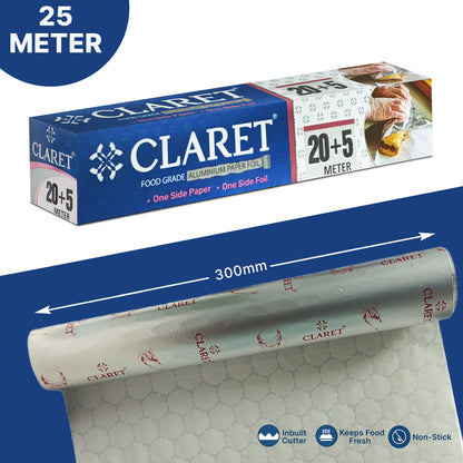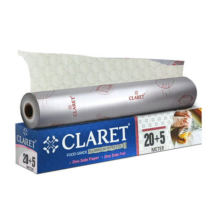Claret Paper Foil Roll 20+5 Meter is a dual-layer kitchen foil combining high-quality aluminium and food-grade paper. Its extended 25-meter length ensures long-term use. Ideal for wrapping parathas, sandwiches, baked items, or takeout meals. Built-in cutter included for convenience.