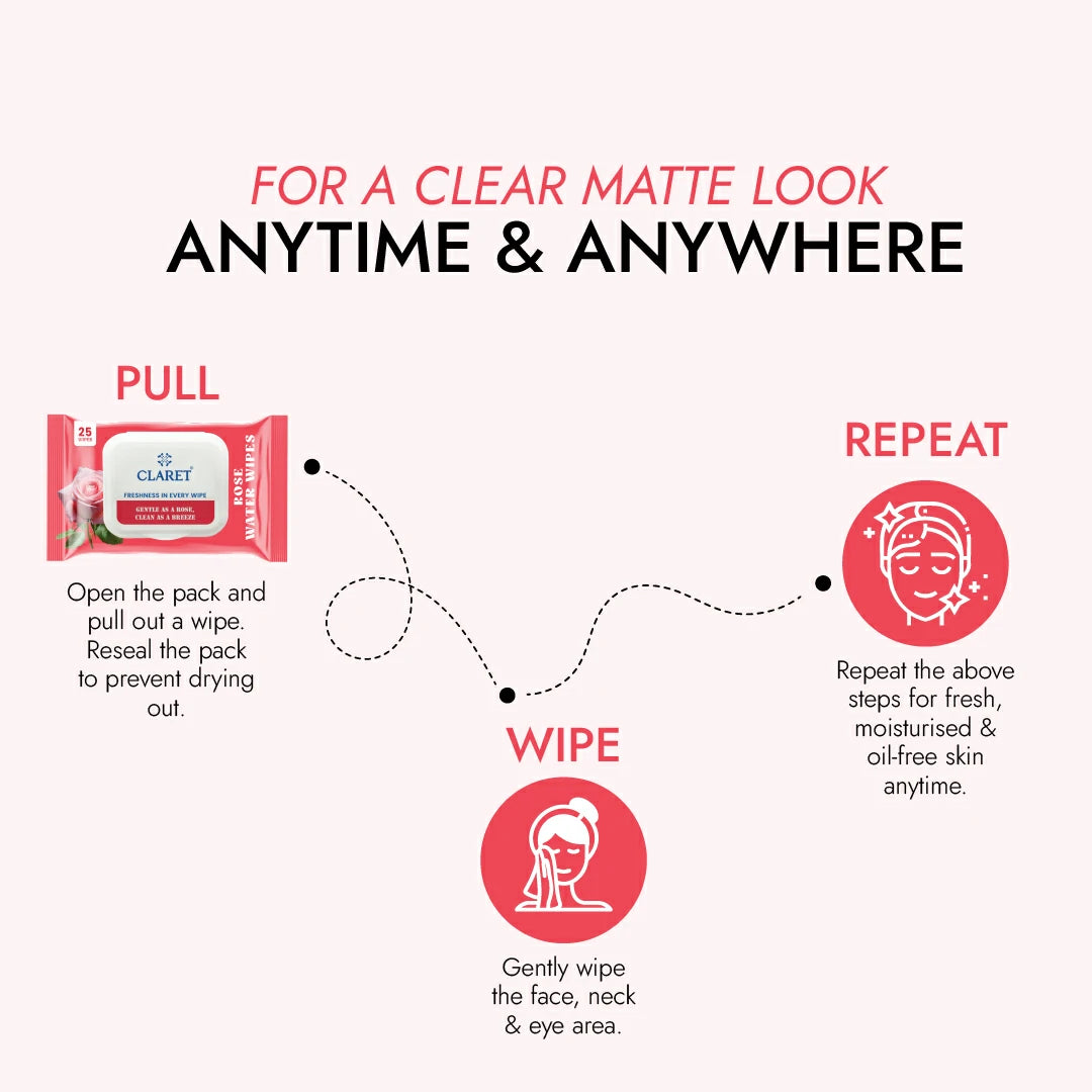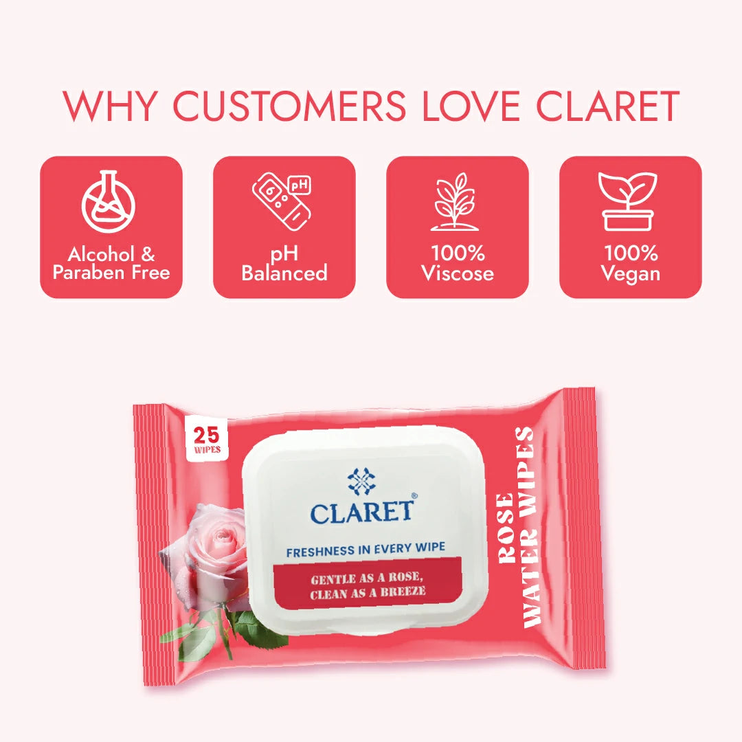 Claret Rose Water Wipes (25 wipes) are dermatologically tested, alcohol-free cleansing wipes that deliver freshness on-the-go. With rose extract, purified water, and soft viscose fabric, they cleanse and hydrate gently. Convenient, travel-friendly, and resealable, they’re your everyday skincare essential.