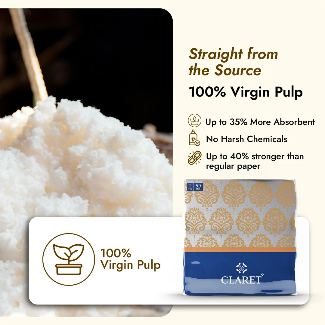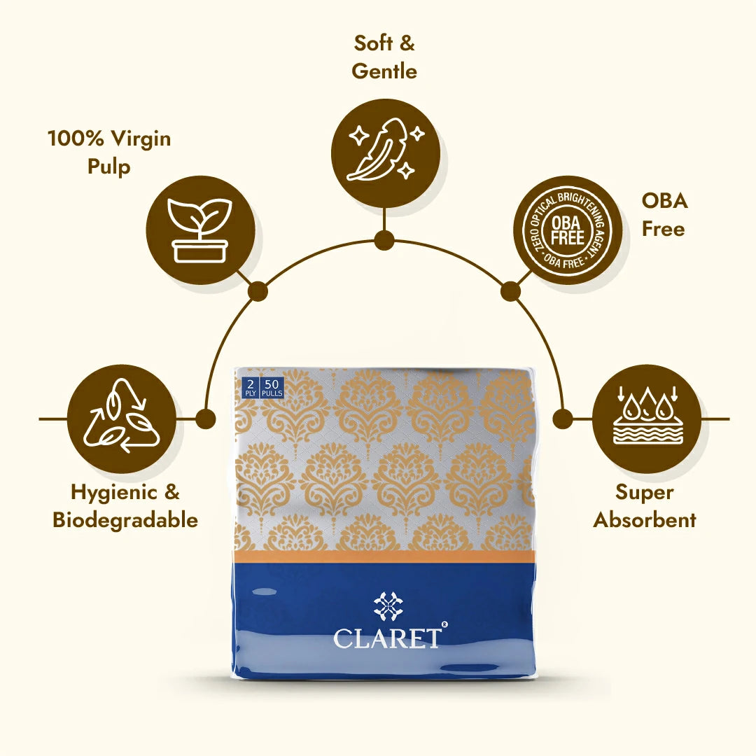 A. Claret napkins are made from 100% virgin pulp, are OBA-free, food-safe, and come with a vibrant printed design that adds style and hygiene to any setting - unlike many generic brands.