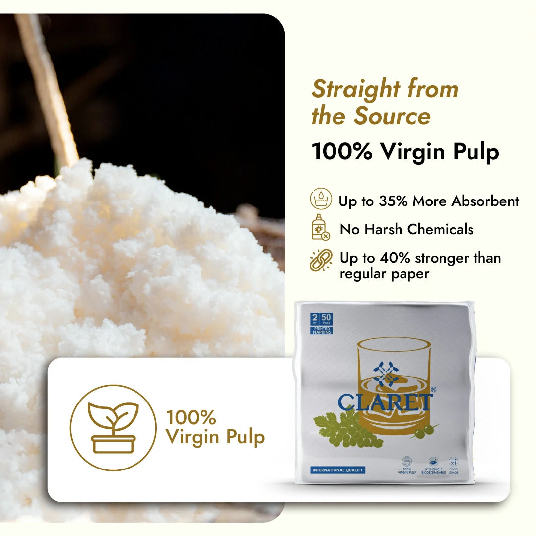 A. Claret Printed Napkins offer a premium dining experience with their elegant design, 2-ply thickness, and large 40 x 40 cm size. Made from 100% virgin pulp, they're softer, stronger, and more absorbent than regular tissues - perfect for both everyday meals and special occasions.
