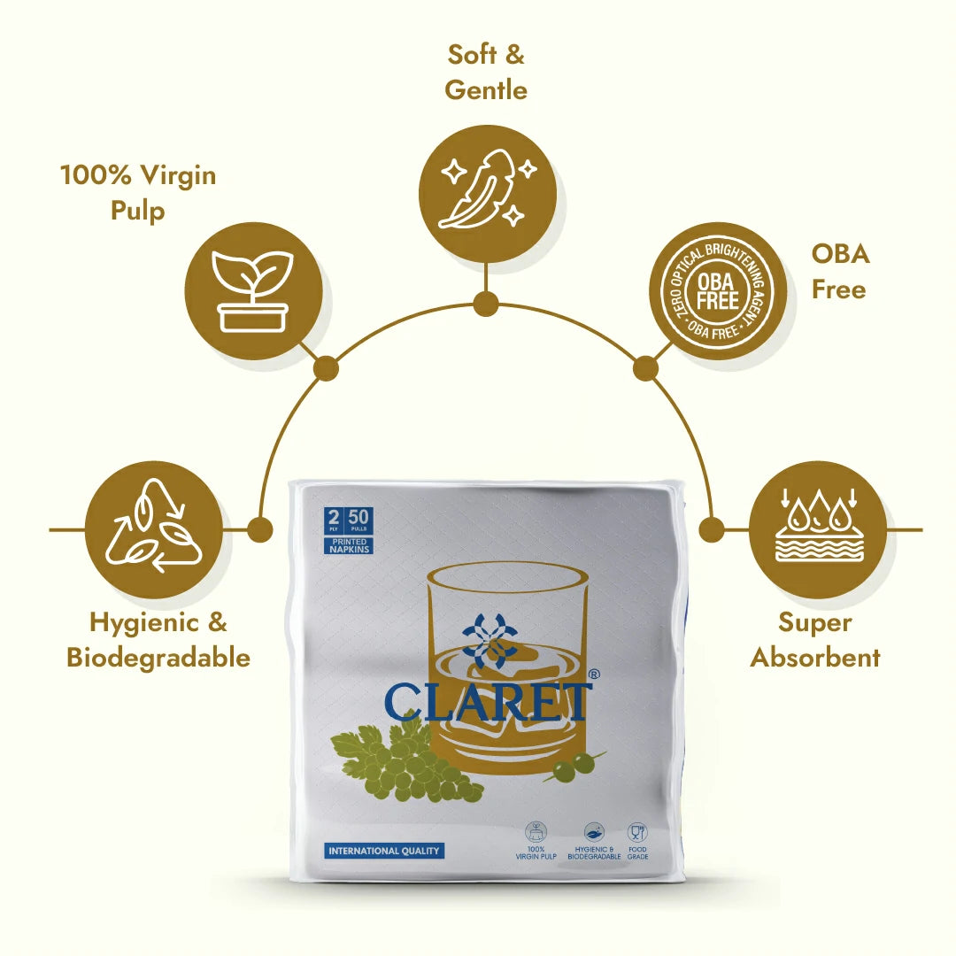 Claret Soft Napkin Printed 2 Ply 50 Pulls (40 x 40 cm) offers a perfect blend of elegance and functionality. With its soft touch, high absorbency, and decorative gold print, this napkin is ideal for home dining, parties, or premium food service. Made from 100% virgin pulp and designed to be skin-safe, it's the hygienic, stylish solution your table deserves.
