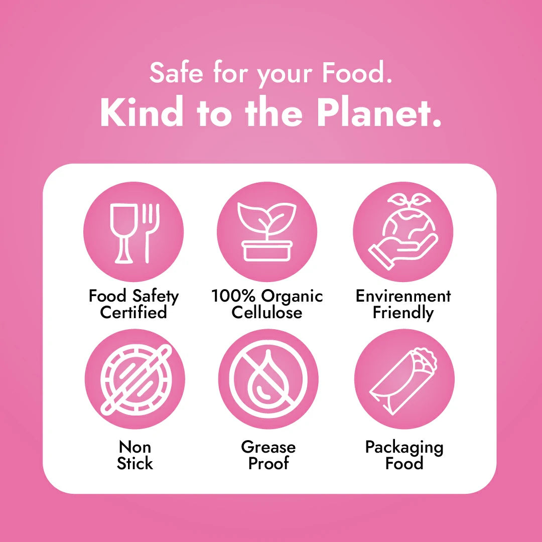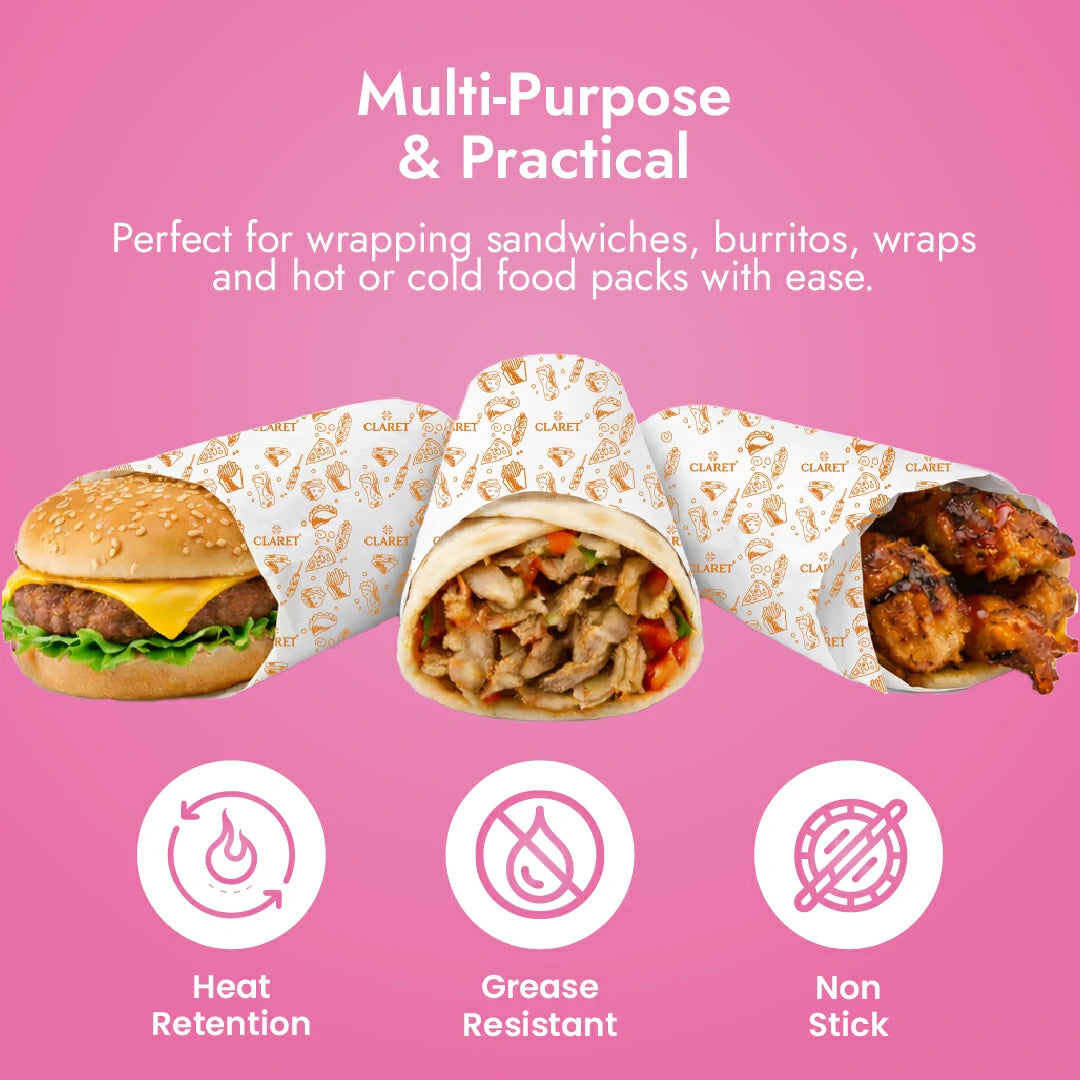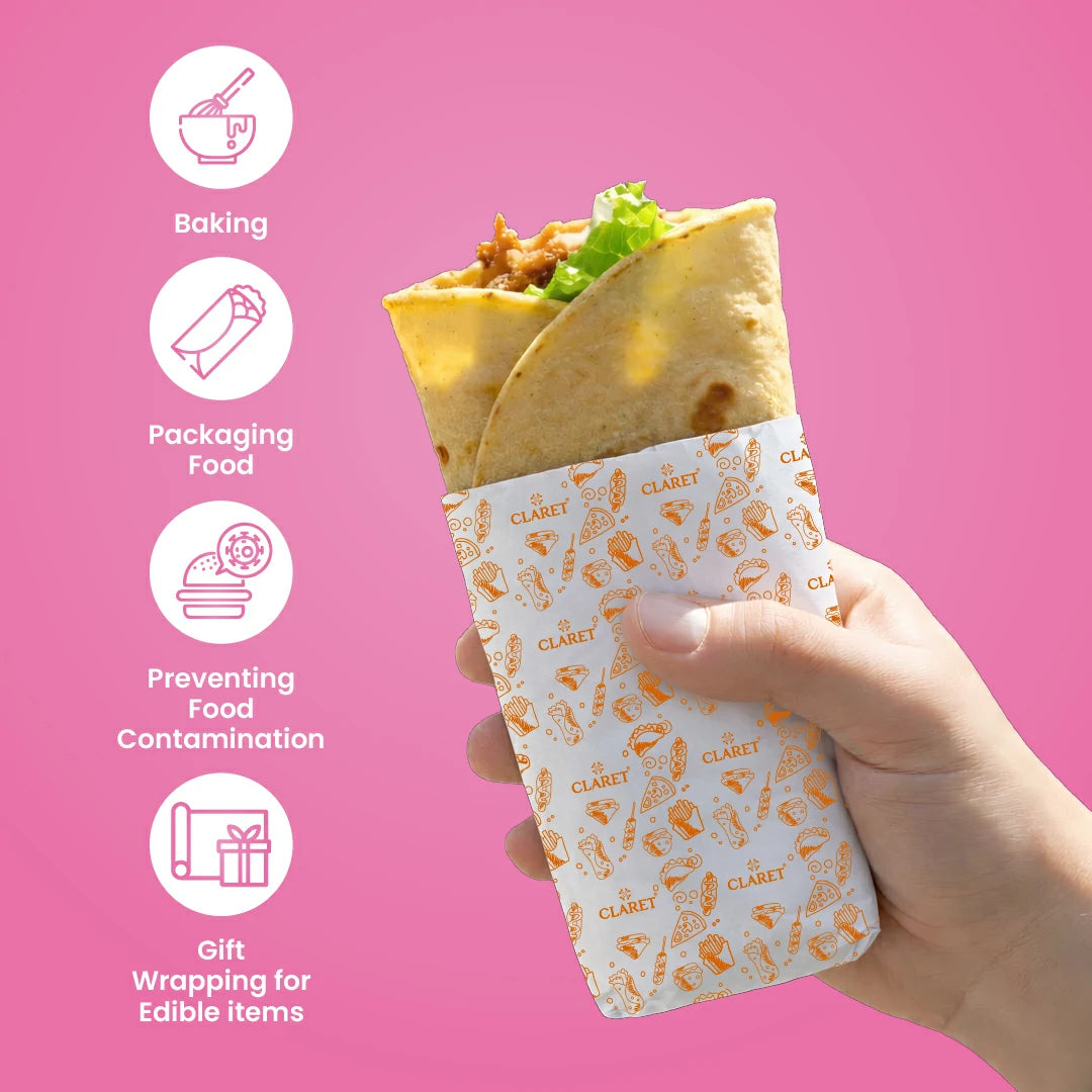 Claret Food Wrapping Paper is your go-to solution for mess-free, hygienic food storage. Designed with an oil and grease-proof surface, it preserves food freshness and taste while preventing spills. The 20-meter roll offers versatile use for sandwiches, parathas, rolls, burgers, fries, and baked treats. With its non-stick, eco-friendly design, Claret makes wrapping simple, safe, and sustainable.